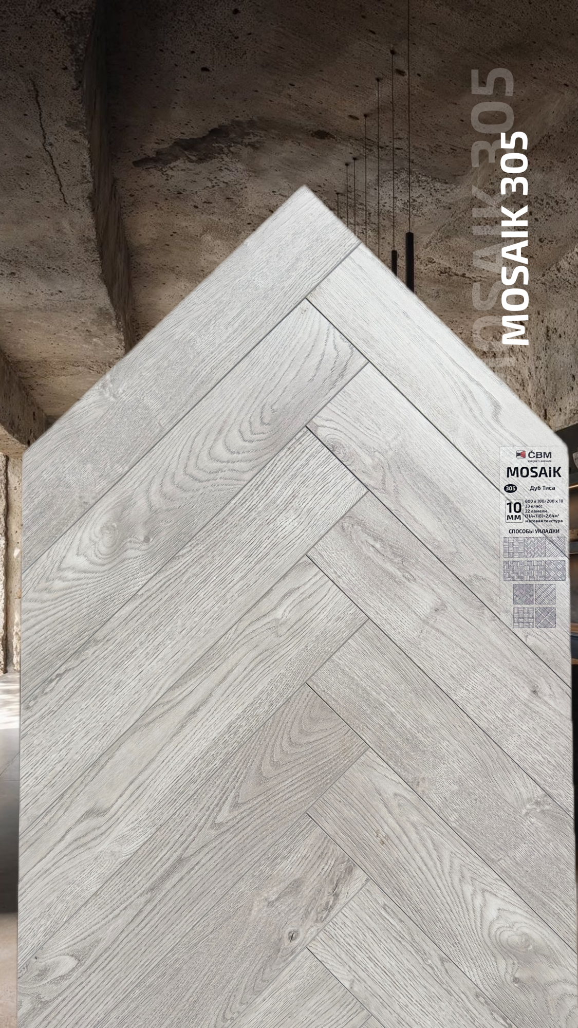 Страна производства Чехия Коллекция Mosaik Класс пожарной опасности КМ 3 Производители ламината Cbm Класс ламината 33 Толщина доски ламината 10 мм Размеры доски ламината 600х200 мм Вид\Имитация материала Ёлочка Упаковка ламината 2,64 м2, досок (11А+11В), 23,4 кг. Наличие фаски ламината 4х-сторонняя Влагостойкость ламината Повышенная Срок эксплуатации ламината (в домашних условиях) 25 лет -