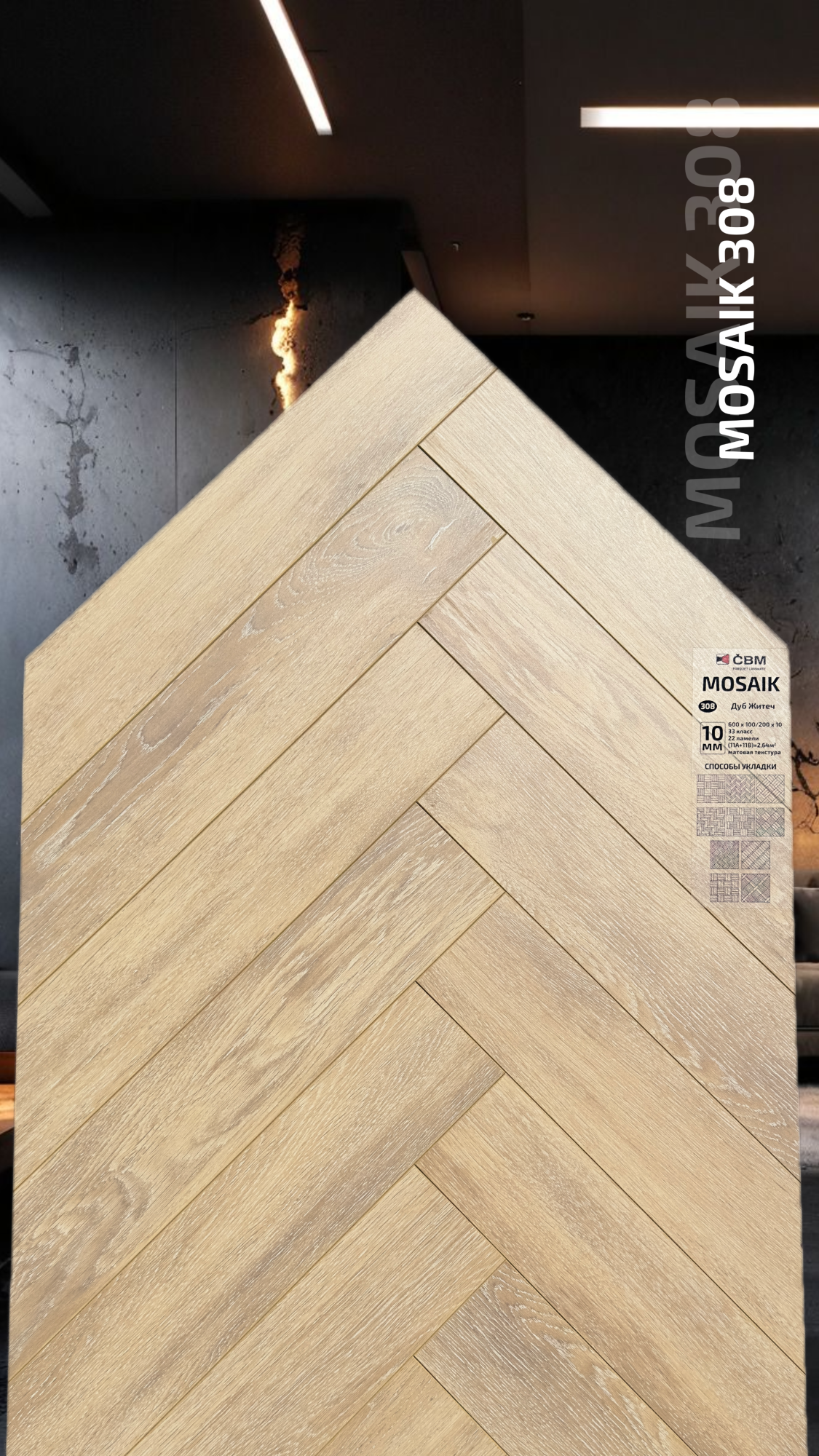 Страна производства Чехия Коллекция Mosaik Класс пожарной опасности КМ 3 Производители ламината Cbm Класс ламината 33 Толщина доски ламината 10 мм Размеры доски ламината 600х100 мм Вид\Имитация материала Ёлочка Упаковка ламината 2,64 м2, досок (22А+22В), 23,4 кг. Наличие фаски ламината 4х-сторонняя Влагостойкость ламината Повышенная Срок эксплуатации ламината (в домашних условиях) 25 лет -