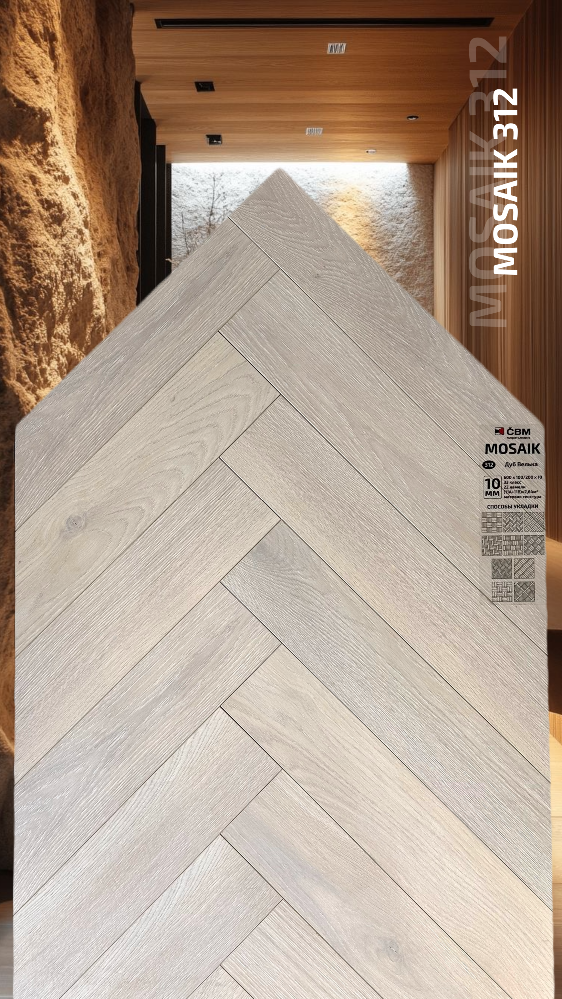 Страна производства Чехия Коллекция Mosaik Класс пожарной опасности КМ 3 Производители ламината Cbm Класс ламината 33 Толщина доски ламината 10 мм Размеры доски ламината 600х100 мм Вид\Имитация материала Ёлочка Упаковка ламината 2,64 м2, досок (22А+22В), 23,4 кг. Наличие фаски ламината 4х-сторонняя Влагостойкость ламината Повышенная Срок эксплуатации ламината (в домашних условиях) 25 лет -