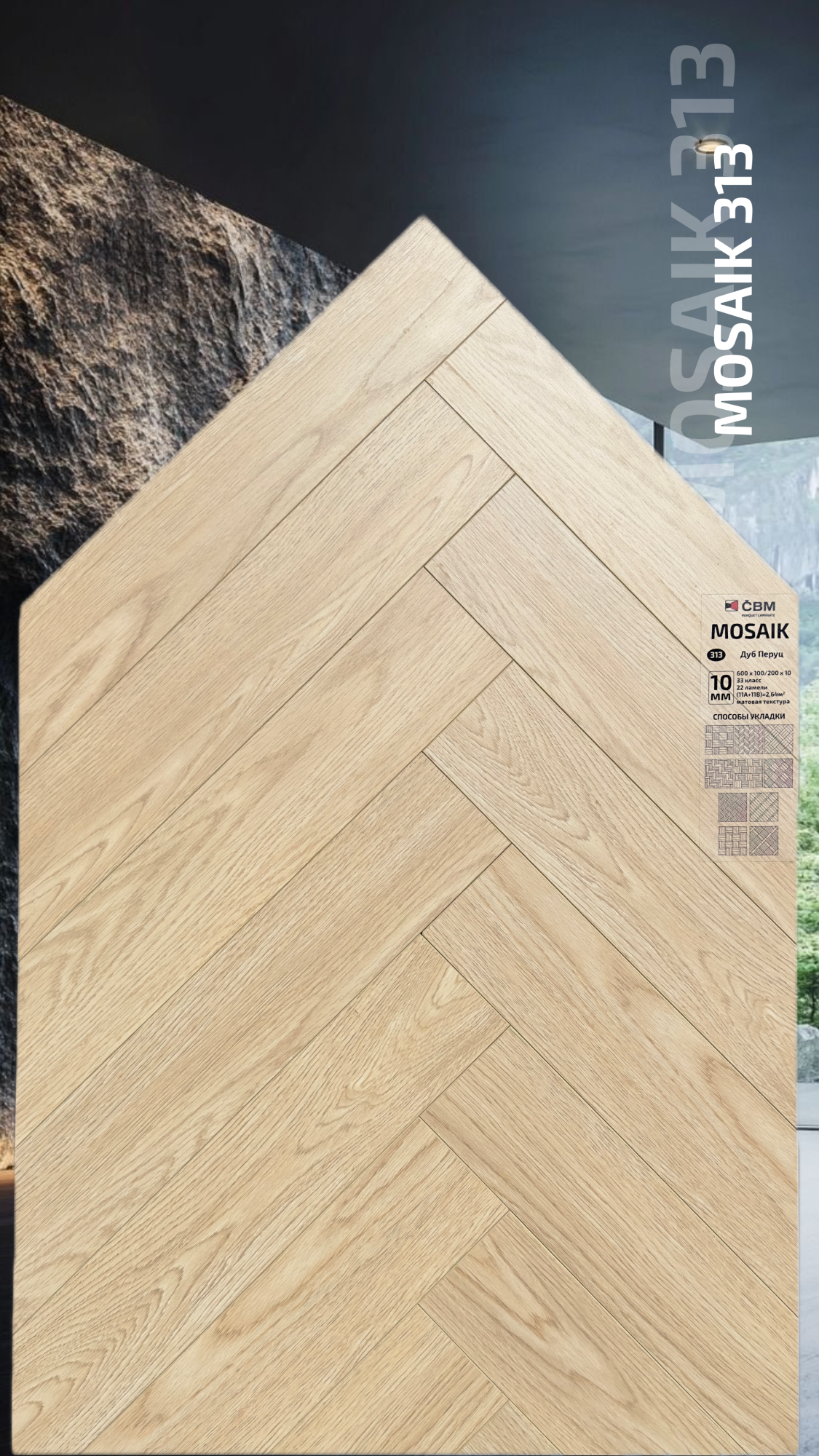 Страна производства Чехия Коллекция Mosaik Класс пожарной опасности КМ 3 Производители ламината Cbm Класс ламината 33 Толщина доски ламината 10 мм Размеры доски ламината 600х200 мм Вид\Имитация материала Ёлочка Упаковка ламината 2,64 м2, досок (11А+11В), 23,4 кг. Наличие фаски ламината 4х-сторонняя Влагостойкость ламината Повышенная Срок эксплуатации ламината (в домашних условиях) 25 лет -