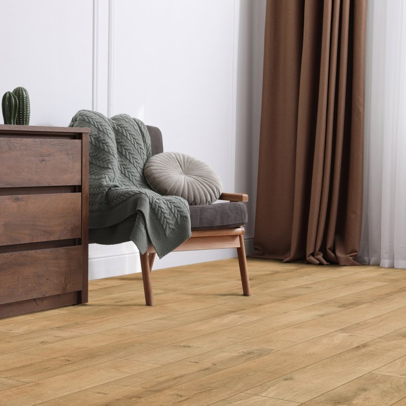 Продукт имитирует доску 1-полосного типа. Поверхность – матовая, рисунок выполнен в теплых коричневых тонах, что подчеркивает естественную красоту дерева. Такой ламинат станет изысканным дополнением к любому интерьеру – дому, офису, магазину, ресторану или даже балкону.