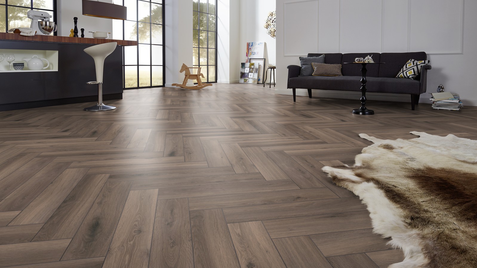 Ламинат Kronotex (Кронотекс) FERRARA OAK — надежный выбор для жилых и коммерческих помещений с высокой проходимостью, так как относится к 32 классу износостойкости. Толщина 8 мм делает напольное покрытие стабильным и комфортным при ходьбе. Система aquaTec защищает замки и основание от проникновения влаги, поэтому его можно без опаски укладывать в кухне, коридоре и в прихожей. Темно-коричневый оттенок и текстура дуба делают интерьер благородным, а рисунок художественного паркета создает выразительную геометрию пола без лишней пестроты. Фаска с четырех сторон визуально выделяет каждую планку и добавляет рисунку глубины. Замковая система 5G ускоряет процесс укладки, позволяя получить надежные и прочные соединения. Антистатические свойства отталкивают пыль. Кроме того, покрытие устойчиво к появлению пятен и использованию бытовых моющих средств, что значительно упрощает процесс повседневной уборки.